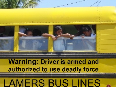 This past week has been an eye opener for the Kat when the tables were turned on her during a discipline situation on her school bus. What started out to be a routine discussion about rules quickly elevated to clever wrestling moves by a five year old child rendering the Kat helpless and unable to escape the moves put on her by the child. It is a well known fact that children who are challenged in one way are gifted in others, this boy had a natural heightened sense of wrestling. The Kat went to the rear of the bus to speak to the child who was out of control, as she sat next to him speaking the boy quickly reacted by putting the Kat into a head lock from which she could not escape. The boy nearly had her down on the floor in a sleeper hold when the Kat remembered her bus driver training and distracted the boy by asking him who's candy that was on the seat behind him. The boy relaxed his grip for a second when he thought of the creamy milk chocolate in his mouth and that was just enough time for the Kat to break free and run to the front of the bus, with tears streaming down her cheeks and hands pressing against the sides of her head while screaming "HELP MONSTER HELP". Soon teachers, people walking by on the street, and two men who had been working under ground on the sewer heard the commotion and came to her rescue. Even a stray cat wandered on the scene, probably sensing one of its own kind in danger. After recounting the experience the Kat has decided that she will not retreat to the back of the bus for any reason again with out her weapon. She is thankful of the legislation passed recently granting the privilege of pilots and school bus drivers to carry fire arms while at the controls. You can bet her gun will be in her shoulder harness at all times now when she's on the bus.
