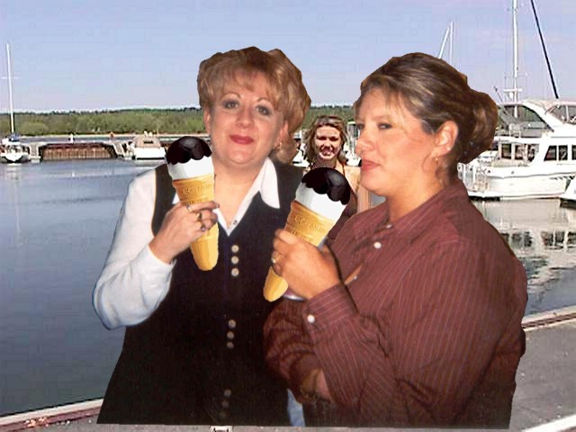 RAE AND STEPHANIE ENJOY THE SPRING WEATHER WITH AN ICE CREAM CONE AT THE YACHT CLUB
