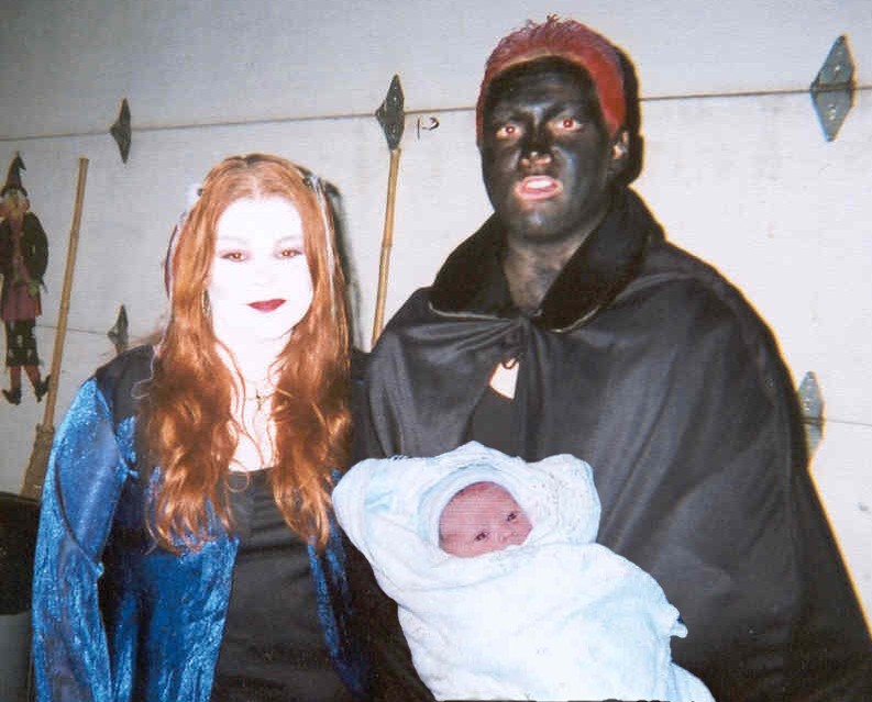 DICK PUTS ON HIS TRAPPING COSTUME WHILE COLLEEN PARADES AROUND IN HER BAR MAID GARB SINGING 17TH CENTURY FOLK SONGS TO CELEBRATE THE BIRTH OF THEIR FIRST GRAND CHILD