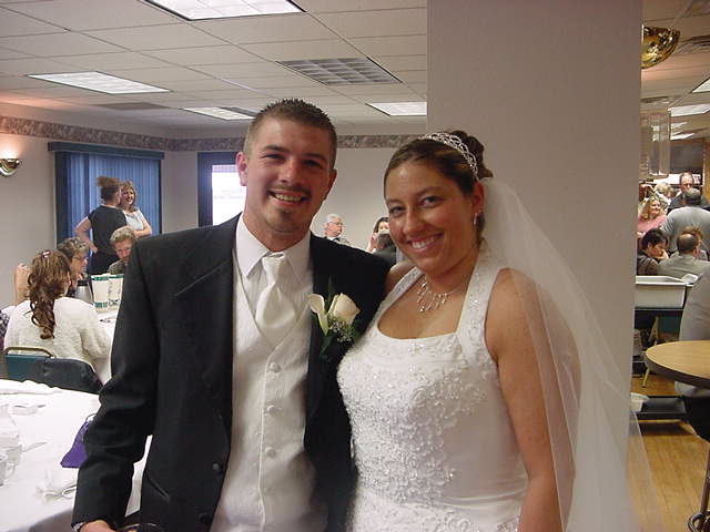 Heather Hahn and Adam Mommaerts were made man and wife Saturday April 30 th. at the Annunciation church on Gray St. in Green Bay. Mommaerts the son of Steve and Debbie Mommaerts (Pickett) is their youngest child making Steve and Debbie officially old. The reception and a very tasty dinner at the Humbolt Haus on Humbolt Rd. east of Green Bay capped the event perfectly. Dance music was provided by a DJ who was also the best man in the wedding party making the grand march slightly difficult. While the music could have been louder I was pleased at times that it wasn't when goat roping selections were played. Our night at the wedding ended with a dead battery in the car when the Kat accidentally left the lights on. Fortunately Dick Gabriel had a set of jumper cables on hand we were able to get a jump start and we were on our way home. Thanks Dick for your help.