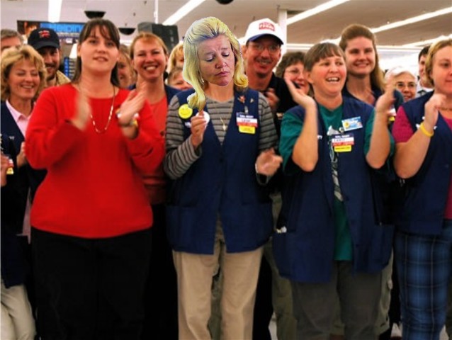 Sobieck, sporting 3 pieces of flair on her vest appears unenthusiastic as she practices the Wal-Mart cheer during her rigorous training
