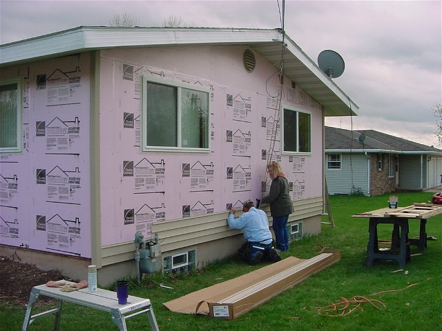 which is showing it's age looks like it has had no improvements since it was built. The modest single story structure is having new windows put in, over a new layer of Styrofoam insulation. Soffet installation has already been completed in preparation of the installation