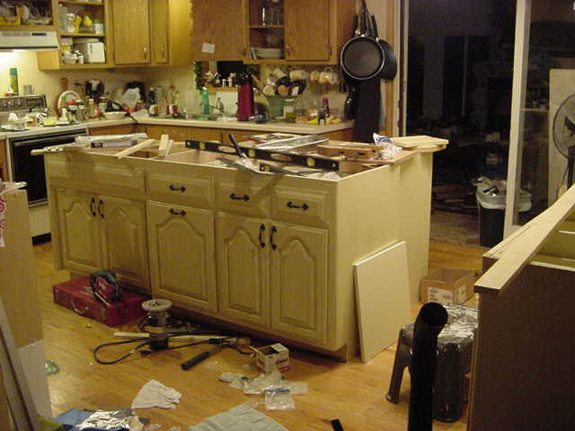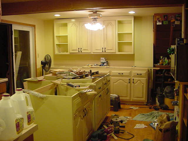 Well you can tell there is no news again when I have to write about my own projects to keep the newsletter going. The kitchen area of THE KAT AND MICK REPORT offices is getting a work over by me and it is finally drawing to a close. While other work still remains on the sunroom floor and removal of the wall and old cupboards, the new cabinets are nearly completed and installed. The Kat is planning a baby shower for Cole and so the kitchen needs to be completed by the coming weekend. Much of the work till now has been tedious but now the installation process has begun and the payoff can be realized because good planning has made the installation process trouble free so far. This is not to say however that the Kat has been helpful in any way as far as planning is concerned. In fact the complete opposite is what actually took place, just when I would be completing a piece she would come along and want this shortened or something else added here or there. The Kat is to be credited however in as far as shopping for parts and picking out the countertop and doing all of the painting and finishing work. She wanted a certain look for the new cabinets and she volunteered to complete all the finishing. I offered no objection of course. She did a wonderful job and was able to turn brand new looking cabinets in ones looking at least 25 years old.
