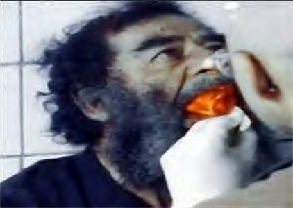 ARMY DOCTORS WORK FEVERSISHLY TO PUT OUT THE FIRE IN HUSSEIN'S MOUTH.