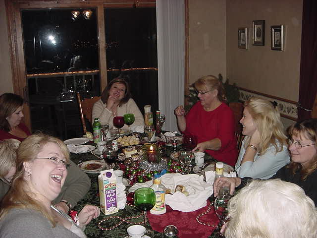 The Fat Club Christmas party was held this year with poor attendance. With only the core group showing up this year, places set at the table groupings went to waste. The main table was of course populated by the women of the Fat Club while the satellite table located in the living room was occupied by Kevin and yours truly.