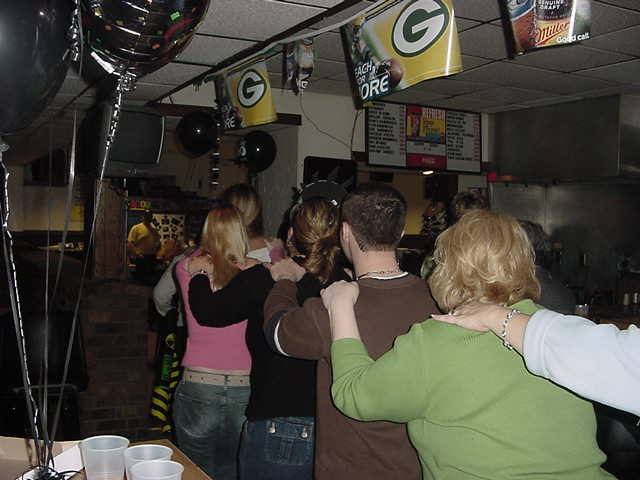 t was a miracle but somehow Jean Poquette Hansen Pulled it off, Trixie Sobieck never knew about her surprise party ahead of time. She was truly surprised when she walked through the door of Bo-Deens bar in Greenleaf and was greeted by a throng of her friends and relatives yelling surprise! Sobeick thought on Friday she had celebrated her birthday with dinner and few drinks with a couple of close friends and relatives in a bar near Hansen's home. J. P. Hansen suggested they stop by the bar across the street just to have a drink and she obliged. On hand were many relatives and guests as well as classmates she had attended high school with. Food had been prepared and a cake was purchased for her by her niece. At a time when everyone was on hand Sobieck was honored with a reading of her life story and followed by the traditional singing of Happy Birthday. The cake was then brought out and she blew out the candles which was not a major accomplishment considering it was just large number candles. Sobieck's life story can be seen by clicking here. The party lasted until at least 1AM and we believe fun was had by all. It seemed most people consumed alcohol modestly with the exception of the Kat, again.