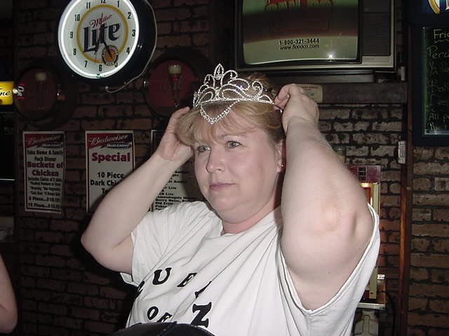 Jean Poquette - Hansen readies herself for Chicken Night several years ago at the height of her popularity by adorning her head with the Queen of Chicken Night Crown