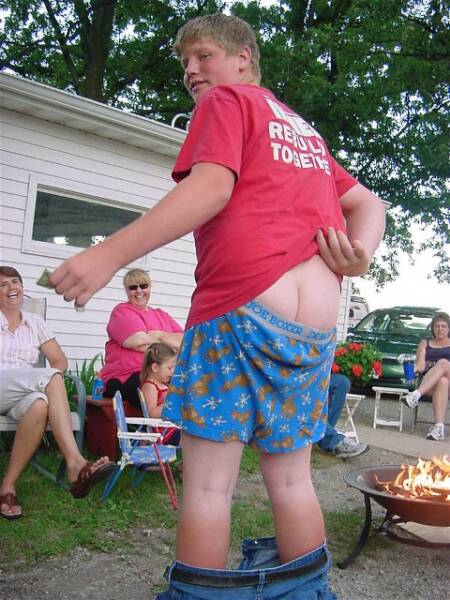 Logan Sobieck still with the $20 in his hand drops his pants for Joanne Lade, Sobieck threw in butt cleavage at no charge.