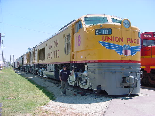 TIM LADE STANDS NEXT TO A GIANT LOCOMOTIVE AT THE ILLINOIS RAIL ROAD MUSEUM