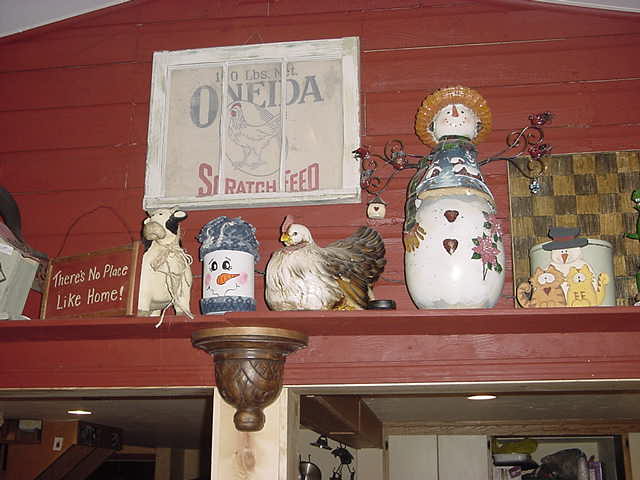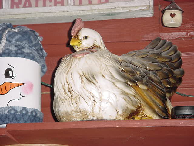 he Kat who is best known for her big heart and not her organizing skills accused two of her sisters this week of plotting to embarrass her by purposely misplacing her beloved ceramic chicken. The Chicken which used to sit on top of the refrigerator as a decorative attraction had been moved long ago to the nick knack shelf which was built in the cold room at Christmas time. The Kat who has inundated (some say cluttered) our home with nick knacks of all types in the past years has recently been unable to keep track of her nick knack inventory and had forgotten about the chicken and the shelf. In a thither and what she considered a "Katastrophie" she scattered to the far ends of the house looking for her treasured Chicken, she even ventured into the no mans land of the garage in search of her ceramic poultry. She remembered that it last resided atop of the refrigerator where it sat regally overlooking the kitchen, she feared it had gotten pushed to the back and dropped behind but an inspection with a mirror and a flashlight only revealed some dusty plastic storage containers and no chicken or chicken parts. She remembered awaking in the middle of the night a few days ago to a noise of which she claimed someone had entered the house. Upon remembering this she insisted that Jean Poquette Hansen and Trixie Sobieck had entered our home in the middle of the night and absconded withe the chicken in an attempt to see if the Kat would actually miss it. She immediately called them both at Trixie's house and confronted them about the alleged theft. They both vehemently denied any partaking of said chicanery however their denial means nothing and only raised more suspicion. It was only after lamenting the loss of her silent pet and looking to the heavens for answers that she spotted the glass farm animal sitting on the shelf in the cold room. Relieved she collapsed in the chair in a cold sweat and recanted her evil thoughts about her sisters. She never withdrew her public accusations of the theft and an apology to Jean Poquette Hansen and Trixie Sobieck has yet to leave her lips.