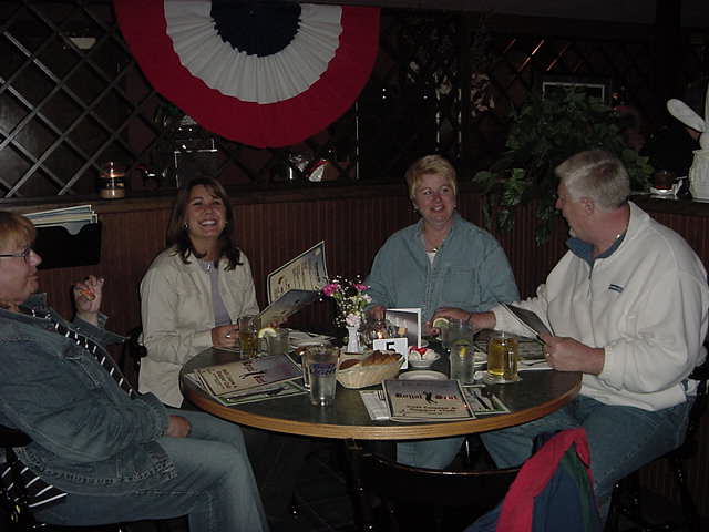 A crowded bar and dining area is not what chicken night goers are used to at the Royal Scot Golf Course clubhouse where usually there is room to sit at the bar and dinner is minutes away. Friday night proved to be somewhat of surprise when we walked in and found standing room only at the bar and tables in the dining room all full of people. The usually modest attendance by the public at the rural New Franken golf course generally allows many CN attendees to cram in to the older unadorned bar at the club with their loud voices and off color jokes filling the air. Waitresses and bartenders readily recognize CN regulars and cater to them without the constant haranguing necessary at other establishments, however Friday night saw none of that with a short wait for a place and a somewhat longer one for orders of food to arrive. Joanie's "in" with one of the waitresses was enough to get us a table in a hurry and no one had to stand long. Aimee Poquette seated at center between the Kat and Joanie reminisced about high school teachers and stories of class mates while the men discussed important strategies for the winning of the war in Iraq. Sadly Kat made the announcement that now she will not mud wrestle Stephanie Poquette at the Memorial Day Party scheduled at the Sobieck residence. They have settled their differences out of the mud ring.