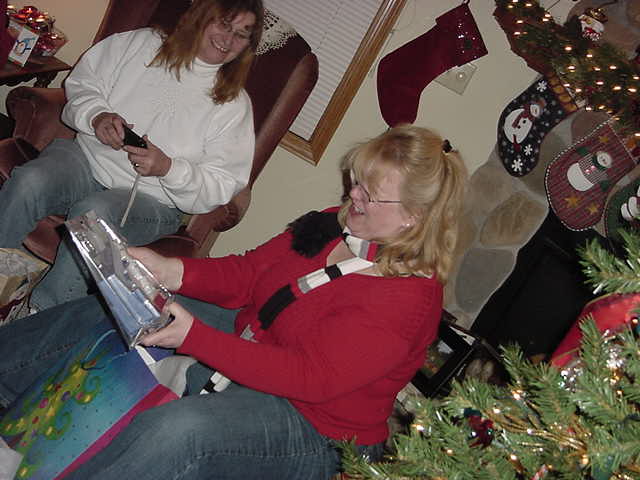 While most members languished in the kitchen Joanne Lade and Snow Danforth gathered dinner paraphernalia and knocked down the extra table set up in the living room where the elderly ate in preparation for the gift exchange. It's a gala extravaganza where everyone shares a gift, an every day household item snatched up from their home wrapped and given to a random member.This year recipients were selected by musical presents, whereby Christmas music is played loudly while members try to pass the presents in a clockwise manner around the room. Some of the heavier presents lagged two to three spots behind while small lighter gifts shot ahead creating large gaps in the chain. Members were all warned before opening their gifts that they were not allowed to reject their gift or conveniently leave it behind claiming to have forgotten it. The gifts ranged from broken dolls to parts of appliances, sewing machines, and potted plants with no soil in the pot.