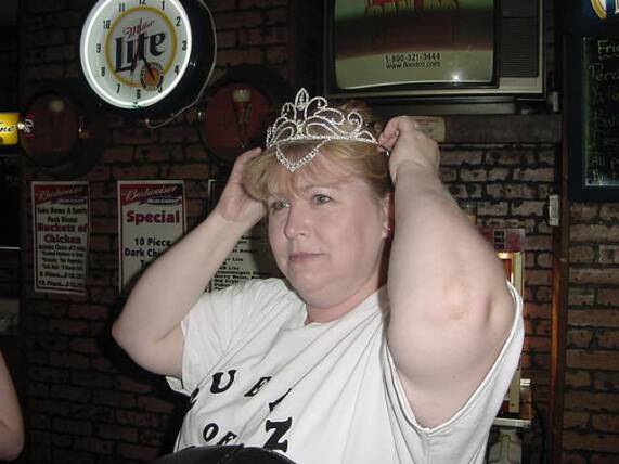 Jean Poquette Hansen fixes her crown as she is about to take her throne at Chicken Night in Cliff and Ceils