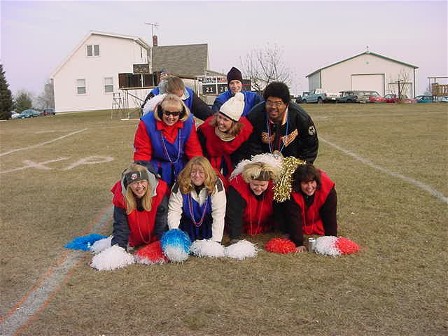 Saturday the XPFL cheerleaders gathered to "bedazzle" their uniforms in preparation for TB-X. The hastily conceived plan was to meet here at the KAMR offices and decorate their dowdy uniforms to bring a little class to the ten year anniversary of the Turkey Bowl. The lighthearted gathering was almost marred by tragedy when Blue Jell-O's squad leader Jean