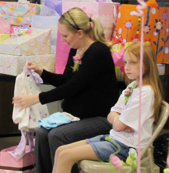 Clara Pickett sits with daughter Ashley opening gifts at Sunday's baby shower