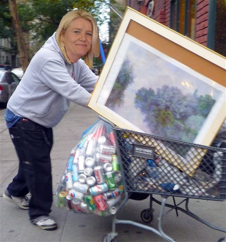 A jobless Eileen Sobieck puts on a brave face while bringing in cans and discarded pictures for change to buy a can of soup for her supper
