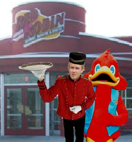 Ben Hansen employed in the starting position of busboy poses with the Red Robin mascot, he may someday be able to work up to that job.
