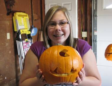 Children and mothers went immediately to the garage where the pumpkin table was set up to participate in the carving event. The men folk along with Joanne Lade and Peg VanLanen congregated in the living room munching on cheese and crackers, chili, and sloppy joes as they watched the Green Bay Packers conclude the game against the St. Louis Rams increasing their continuous win record to 6 wins and no losses.