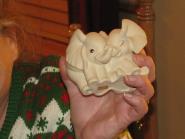 Real white elephants awarded to Jean Poquette-Seidl during the gift exchange