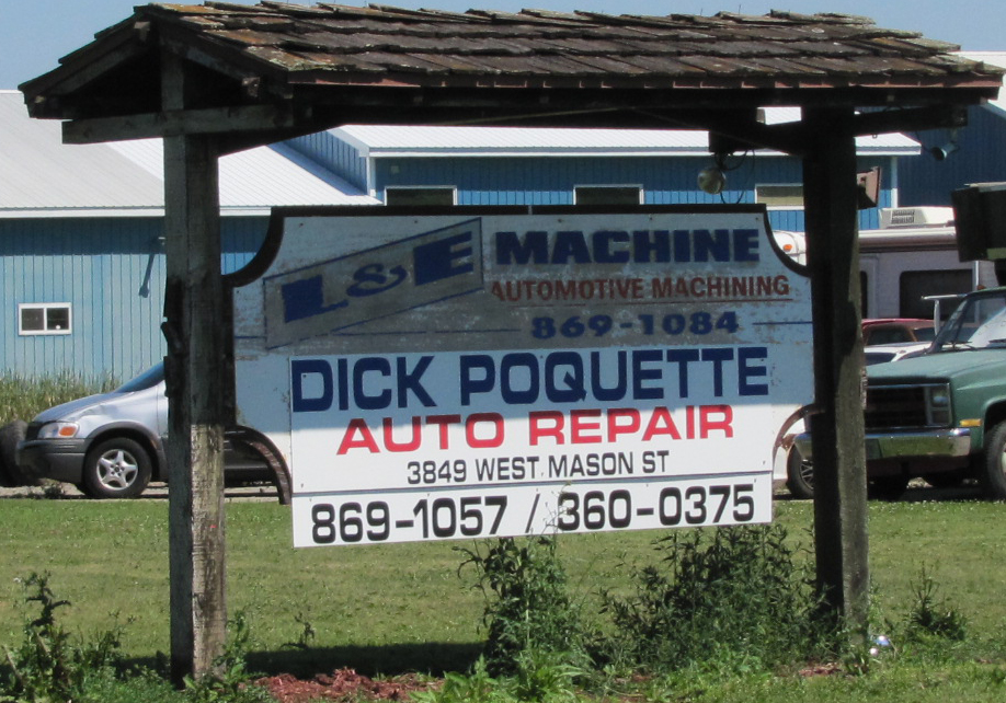 Earl Poquette Jr. along with Lyle Cole quit working for Libert Machine a well known engine rebuilding business in green bay over 40 years ago and started L & E Machine in a small building on South Broadway across the street from the now defunct Diana Paper Mill. Business was so scarce Poquette recalls that they also performed blueing of guns in the shop, something left over from the previous tenant that Poquette and Cole took over to augment their engine rebuilding business. After the first year they dropped the blueing business and concentrated on the engine business that started to take off. Soon the pair purchased a former dog kennel across from the fair grounds in De Pere and expanded, adding a crankshaft grinder and some new machines. Cole later dropped out of the business and Poquette bought out his share. It was about the same time that the present location on West Mason became available and the L & E business was moved to that location. The shop was much bigger than Poquette needed and along with his brother Sam and sometimes with the help of another brother Dick Poquette the business began to repair automobiles. Work was plentiful but the need for insurance for the brothers was too much for the fledgling auto repair business and the brothers found work elsewhere where they could get insurance. Poquette went on along for many years alone until Dick Poquette who was fixing cars in his garage at home decided to expand and purchased the property from Earl moving him into a new addition on the south side of the building, as it is today.