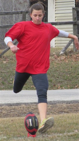 Christine Meeuwsen kicks off the game ball to start TBXV, later it was determined that her club leg gave her an unfair advantage
