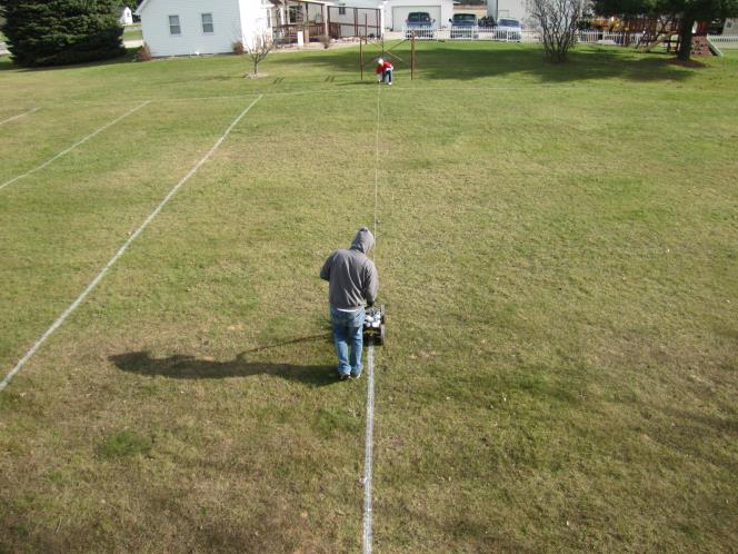 An unidentified random grounds department worker follows the string held by Alex Pickett as he try's to spray a yard line marker