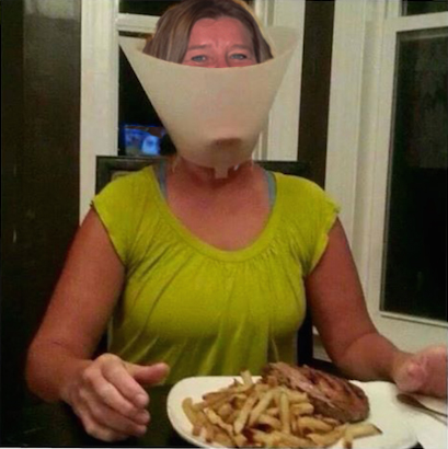 During a regularly scheduled fat club meeting on Saturday Sobieck introduced her new weight loss device to other members of the group saying that the idea has worked wonders for her. Pictured above Sobieck sits with a plate of fries and chicken breast but was only able to get about a hundred calories from the meal she explains as most of the food never finds it's way to the mouth. While the device seems cumbersome in some respects says Sobieck you can get used to it in a modest amount of time and learn to deal with the problems associated with wearing the cone. She explained: "For example, a lot of food ends up around your neck trapped inside the cone and becomes a nuisance after it rots a bit and starts to smell. What I usually do is run out on the lawn and do a summersault and it fly's out due to centrifugal force. That's just one of the little tricks you learn after wearing the cone. After that a little sprits with the garden hose and you're as fresh as a daisy."