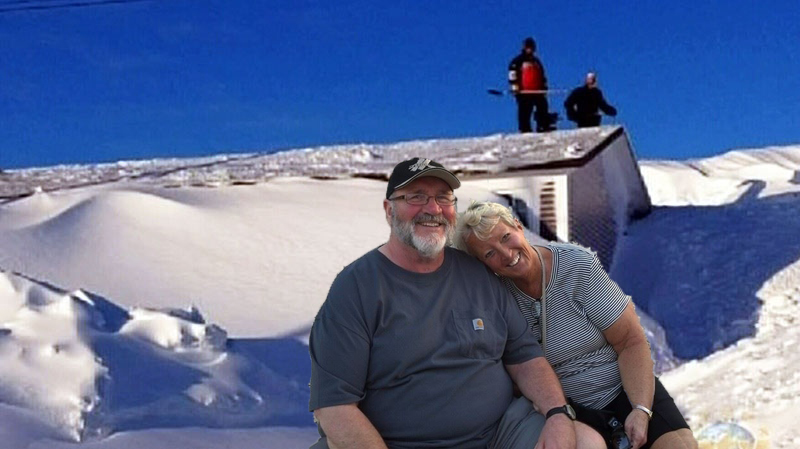 Poquette and Glover sit in front of their home after the blizzard while men remove snow from the roof