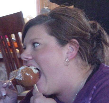 Stephonia Prevost enjoys a Carmel apple at Jean Poquette-Hansen's Annual Pumpkin Carving Party
