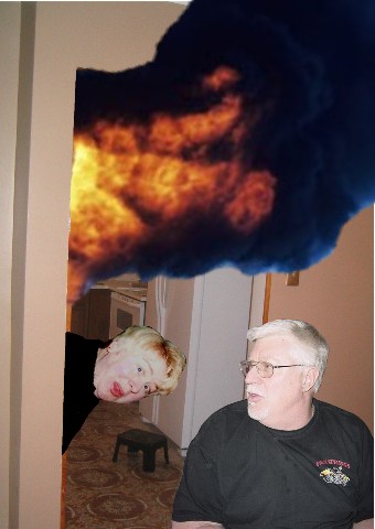 The smoke and fire did not go unnoticed by Lade's husband Tim as he began reminding her of her cooking responsibilities. The Kat chimed in as well stating an old Poquette cliche' used by her father frequently "You can't cook in the kitchen by watching TV in the living room." Lade felt bad about the accidentel fire and began to eject the smoke via the kitchen fan while husband Tim moved the portable fan to various locations of open doors and windows. The smoke sensitive family dog named Cuckoo I believe, was headed to one end of the house where he eventually waddled into a spare bedroom, it is there that he remained until the air was clear.