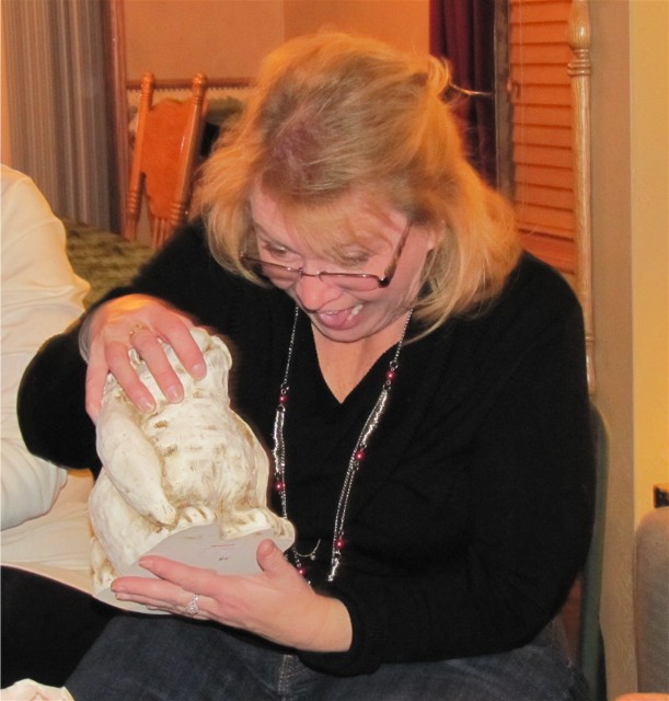 Jean Poquette-Seidl ogles over the gift of a plaster rabbit at the gift exchange
