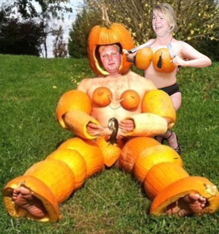 Poquette-Seidl and husband James put on costumes for publicity photos every year to pump up the attendance at the annual carving which will occur this Saturday beginning at 12:30 PM at the Seidl's simple but functional Greenleaf home. This years creation (seen at right) is designed to show off Poquette-Seidl's remarkable weight reduction and body transformation. Seen here joking at lopping off her pumpkin breasts, nothing could be farther from the truth as she holds her hooters in high regard and proudly keeps them tucked away behind the pumpkin rinds. While James appears to be annoyed by the costume he actually has a good time every year dressing up and can't stop talking about it before, during, and after the event. Seen here as Pumpkin Man, Seidl only paused for the photo a few seconds before rambling on again about the costume's details.