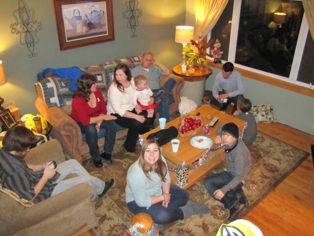 getting information for me about how long to cook the potatoes'. Next came the rest of the Tremls who all pitched in to help while I cut up the ham. Dinner this year was a bit late and came at about 7 PM but no one seemed to mind and everyone kept busy chatting or watching the free presentation of the Turkey Bowl number XV. All in all after the count was made it would seem that 62 people attended the Christmas Eve party this year not counting the Kat and myself.