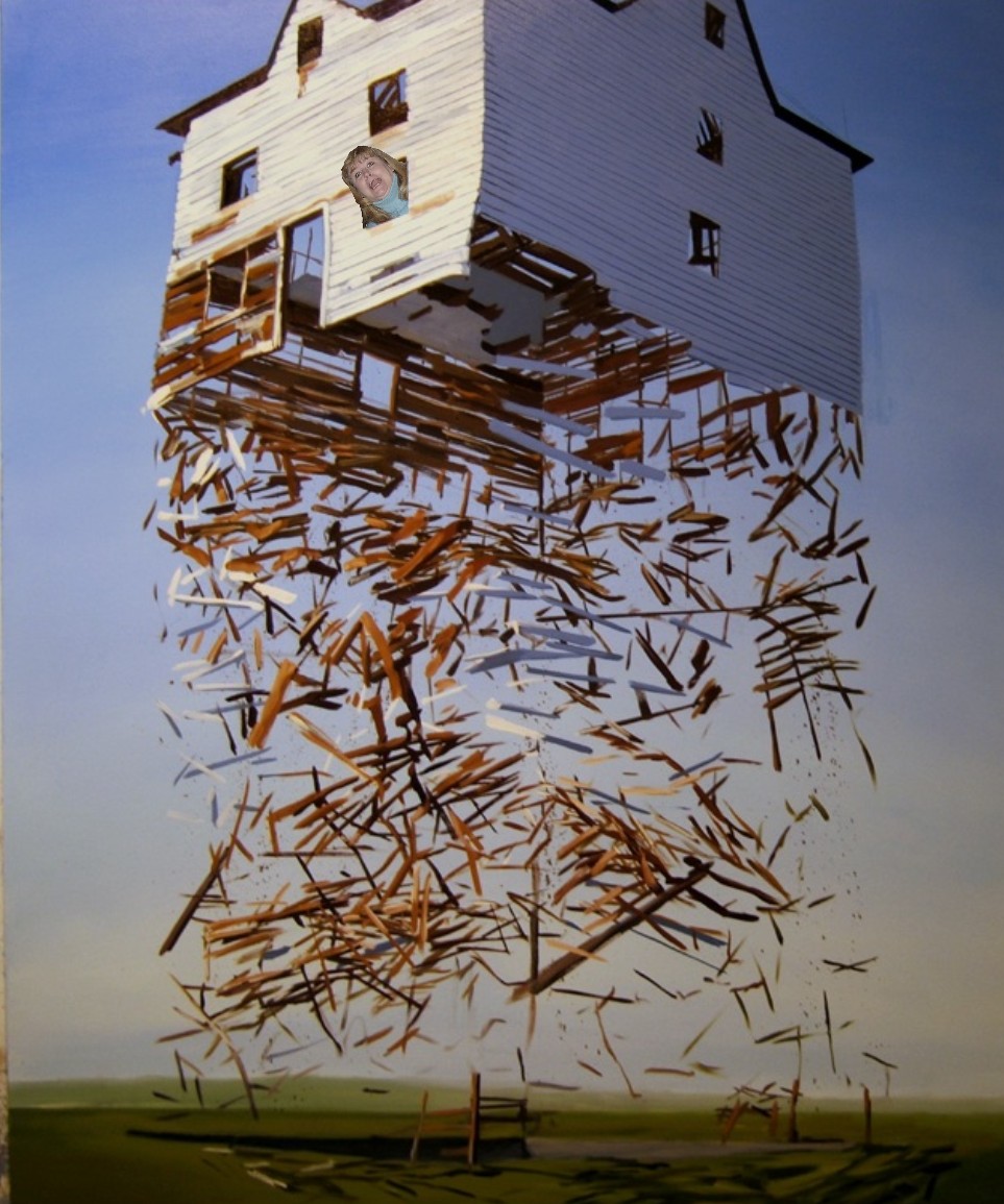 Jean Poquette-Seidl panics with her head out the window as her house fly's into the air in this dramatization of what could have happened.
