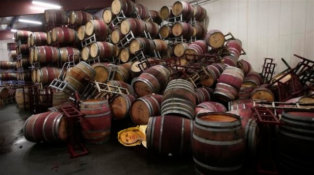 Cheryl Purshock seen here buried under wine barrels after the earth quake two weeks ago