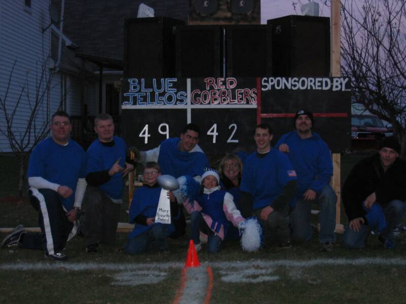 Once again with a zest for the game the Blue Jell-O's were victorious at the fifth Turkey Bowl to be played at the popular Poquette field in the Village of Hobart. The Blue Jell-O's, winners now of two consecutive Turkey Bowls celebrated with ground bologna sandwiches and pie in Sobieck Hall adjacent to Poquette Field. It was a cold and windy day at the field and some of the older more decrepit fans were unable to stand the weather and remained inside while the game was played. Such was the case with the medical staff of Peg VanLanen and Mary Ann Meeusen who never ventured out to the field the entire day. The Oneida Red Gobblers did not take the defeat laying down however and proved to be a formidable opponent for the Hobart Blue Jell-O's keeping the score just one touchdown apart until the very end. Many times the a glance at the score board would reveal a tie game but in the end an interception in the end zone in the final two minutes of the game by the Blue Jell-O's proved to be too much to overcome and the Red Gobblers succumbed to the Jell-O's. Red Gobblers Brandon Pickett, team captain, returned one of two interceptions he had during the game for a touchdown while team mate Mike Van Den Heuvel had three touchdown catches in the first half of the game. Van Den Heuvel achieved a milestone never before seen at the Turkey Bowl and is entitled the the MVP award for his team. The Blue Jell-O's had their own stars who shined as well like Jules Cornelius, team captain, also named "the Bus" by the announcing staff because of his unstoppable runs. Three or four lineman could be seen hanging off the back and sides of the Jules as he advanced the ball time after time for a first down. Also making a notable dent in the Red Gobblers defense was back Ben Hock who with great finesse and shear determination gained over 200 yards in the game earning him TB V MVP status by announcers Mike Pickett, and Whitey Cornelius. With nearly a full compliment of players on each team, this years full tackle football game on Poquette field proved once again to be an exciting exhibition from kickoff through the half time demonstration of "home made explosives", to the end two minutes where the Blue Jell-O's emerged victorious. Thank you's go out to all who helped make TB V a success. Dick Poquette, scaffold for speakers - Kevin Sobieck, providing set up of platforms, tents, and scoreboard, tools, ladders, and equipment - Trixie Sobieck, sign painting, modeling - Brittany Sobieck, manning the scoreboard and modeling - Dawn, scoreboard - Whitey Cornelius, announcing - Jo Anne Lade, announcing, singing national anthem - Kat Pickett, Jean Poquette Hansen, sing national anthem - Scott Treml, video - Mike Pickett, sound - Clara Snel, laptop for sound - Dan and Don VanLanen, halftime fireworks - Jeremy Bubannas, general labor - Earl and Sam Poquette, officials. Hopefully TB VI will be as successful as this one was.
