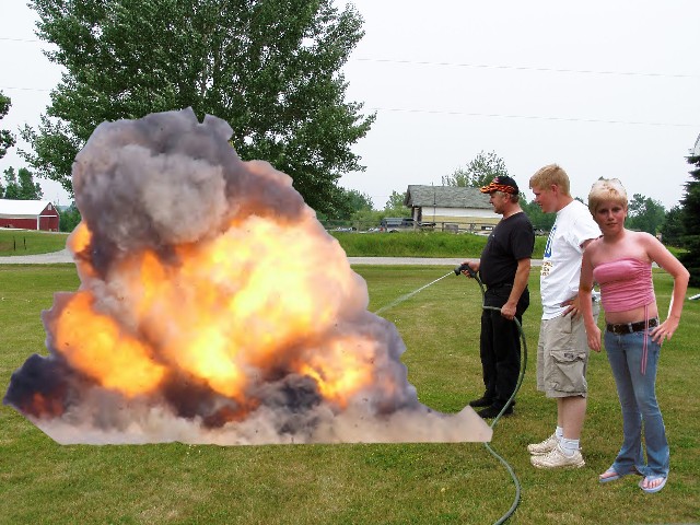 With their parents away most of the time using every spare minute they have to work on the Queens home, Justin and Logan Sobieck found that manufacturing WMD's in is great for passing those many lonely hours. Common household products are the only ingredients needed to produce explosions of a disturbing magnitude. The manufacturing process, the brain child of Logan, takes place in their back yard. It is basically a chemical process which Logan learned from an unnamed friend. The secret combination of ingredients commonly found on store shelves were mixed again and again for testing purposes until just the right combination was formed to create the weapon. I witnessed the creation and detonation of several of the weapons including an oversized one leader container. Logan creates the weapon right at the detonation site while onlookers stay back at a safe distance, in our case the deck behind the Sobieck home was our safe zone. Justin never sets the weapon or mixes the final ingredients, it is thought there would not be enough time for him to hobble away before detonation. When the right combination is complete and the container is sealed Sobieck calmly walks away from the explosive explaining to those watching that a couple of minutes will elapse while the chemical reaction plays out. From our vantage point it seemed nothing was happening but soon the container, viewed through field glasses, was seen to fill with smoke and seconds later a magnificent explosion took place. Sobieck explained that the US military has already expressed interest in the device and that it will be hard to keep this out of terrorists hands.