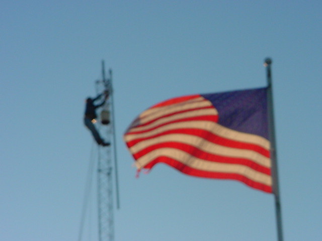 We worked until dark and the antenna was up when we quit. We were unable to put it on the air due to a wrong connector on the existing heliax, so Steve will have to climb the tower one more time and install the connector. At the same time we will rehang the cable to a more desireable area.