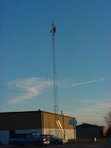 Last sunday I spent the day with my friend Steve Konopka at the Oneida Fire Dept. Some time ago our tower was hit by lightning and our antenna was taken out by a direct hit! We have since purchased a new larger antenna and Sunday Steve and myself mounted it atop the 70 foot tower. I would like to say that I helped Steve on top of the tower, however when it comes to climbing I'm a wimp. I was the ground crew and sent things up the tower via a rope, and when Steve needed something pulled or eyed up I was there.