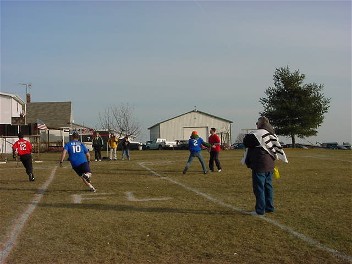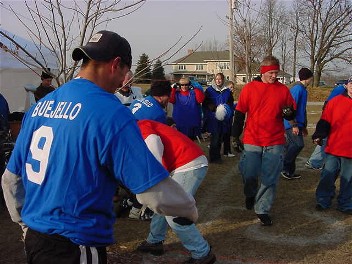 9 PLAYERS PER TEAM - TEAMS ARE LIMITED TO 9 PLAYERS BECAUSE OF THE SMALL FIELD. IF A TOTAL OF 18 PLAYERS ARE NOT AVAILABLE THEN PLAYERS MAY BE TRADED TO THE OPOSING TEAM TO MAKE THE SIDES EVEN. SHOULD AN ODD NUMBER OF PLAYERS OCCUR THEN 1 OR MORE PLAYERS MUST SIT OUT.