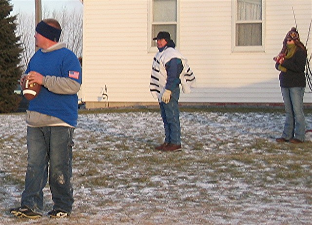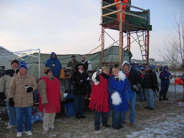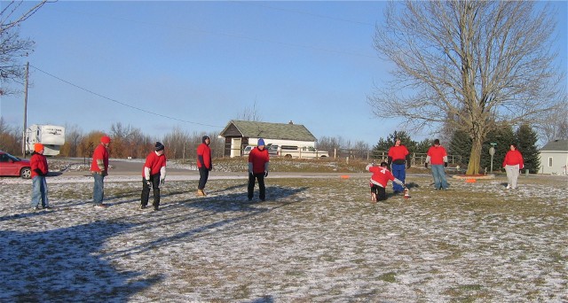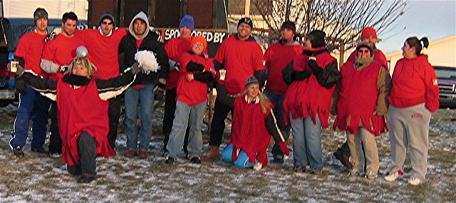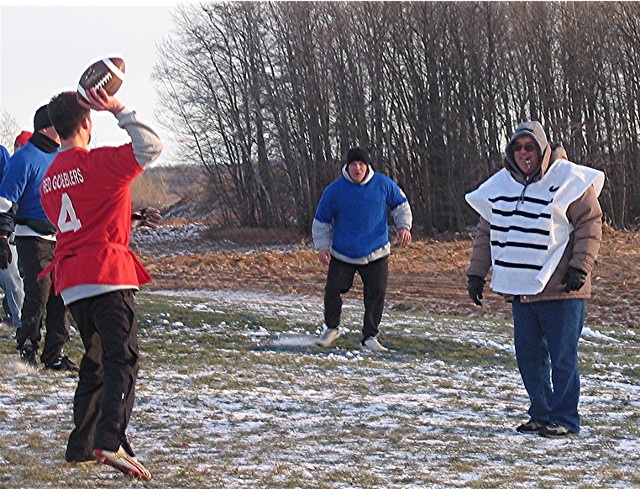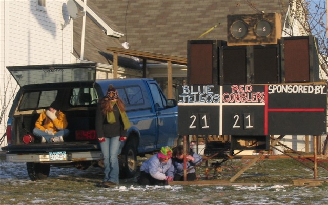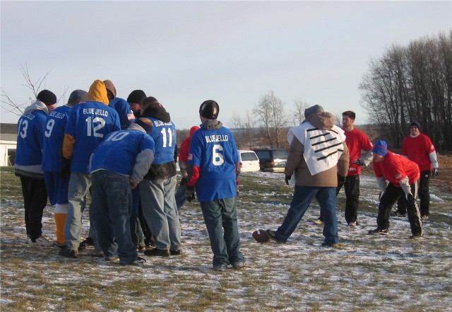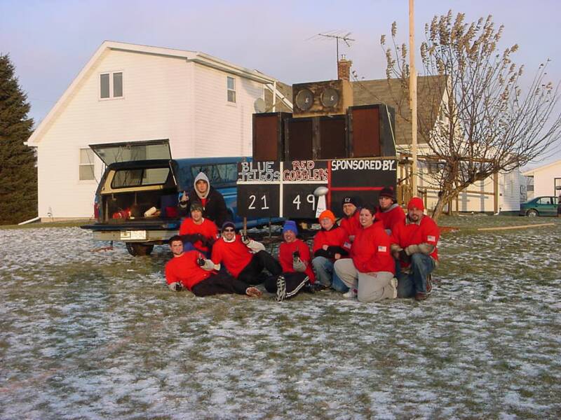 a westerly wind blew at a steady 28 miles per hour with gusts to 35 miles per hour. Frozen snow covered the field which had fallen two days before the game. This by far was going to be the coldest Turkey Bowl ever! The game was close in the first half with each team taking turns taking the lead. In the second half the Blue Jell-O's lost the ability to score and the Oneida Red Gobblers broke out and went ahead and in the end they overwhelmed the Hobart Blue Jell-O's with a score of 49 to 21. The Turkey Bowl MVP was Jason Schmunkey with a whopping 3 interceptions and a fumble recovery which was certainly a contributing factor in the Red Gobblers domination of the second half of TB VI.