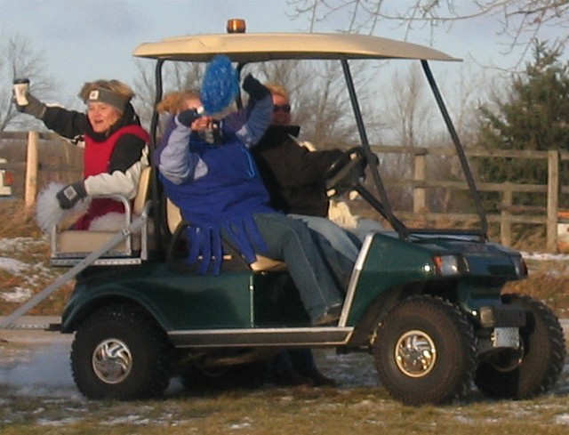 XPFL Cheerleaders Trixie Sobieck, Jean Poquette Hansen, along with sports announcer Joanne Lade tear around the end zone during play action with a club car.
