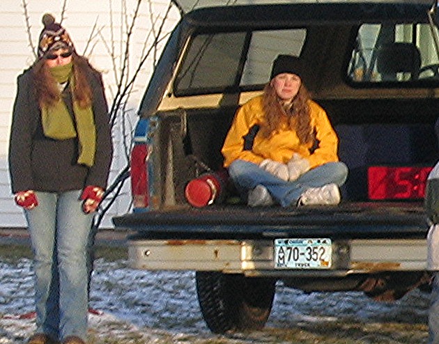 Score board girls Brittany Sobieck and Ashley Hansen take a break during a lull in the action