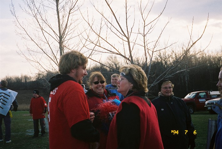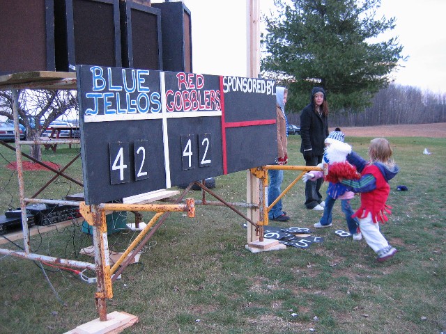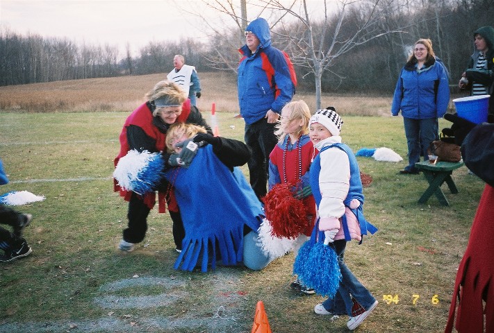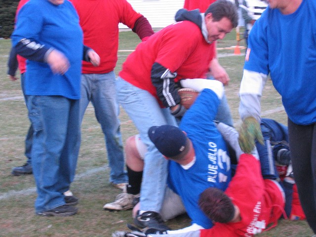 One of the Red Gobblers slams into the turkey at the far end of the field.